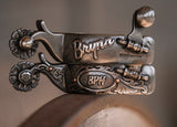 Add a custom touch to your spurs with initials, a name, livestock brand or logo. Typical turnaround is 6–8 weeks.